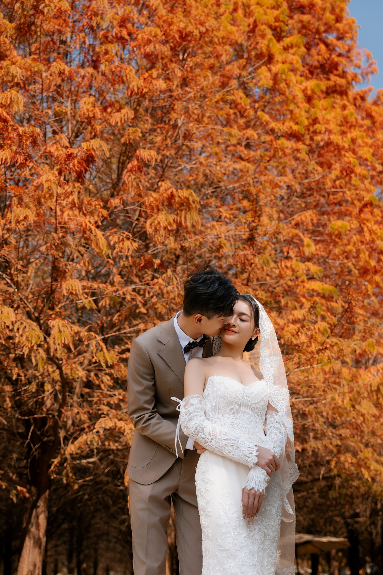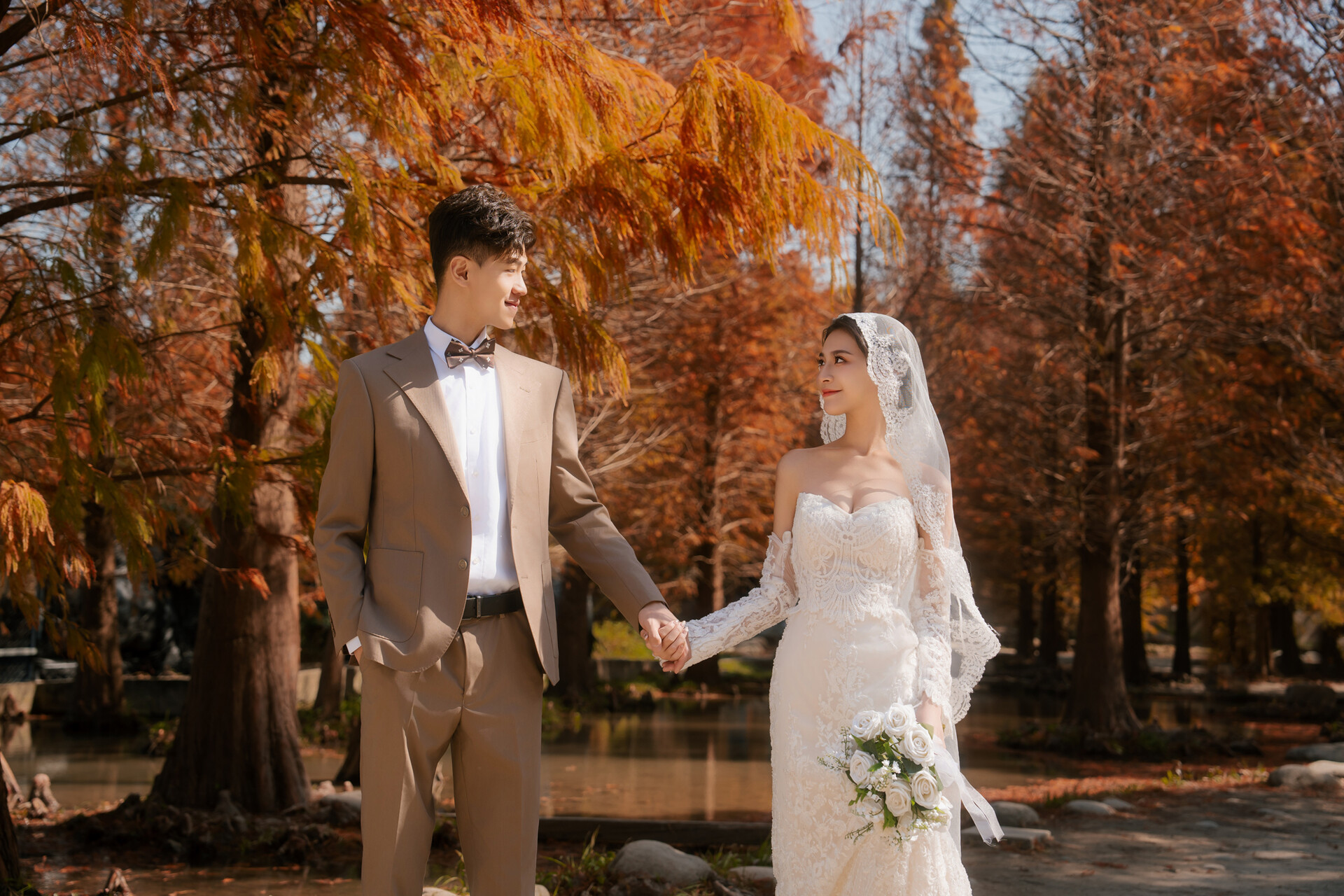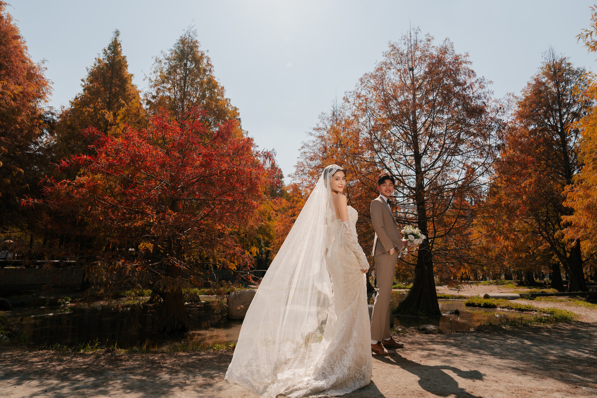 陽光穿過枝葉縫隙落在地面,光影交錯之間,白紗被映襯得更加純淨。當新人漫步於林間小徑,裙襬掃過落葉,紅褐色調與禮服的潔白形成細膩對比,畫面自然流動,情緒在森林的包圍中慢慢展開。