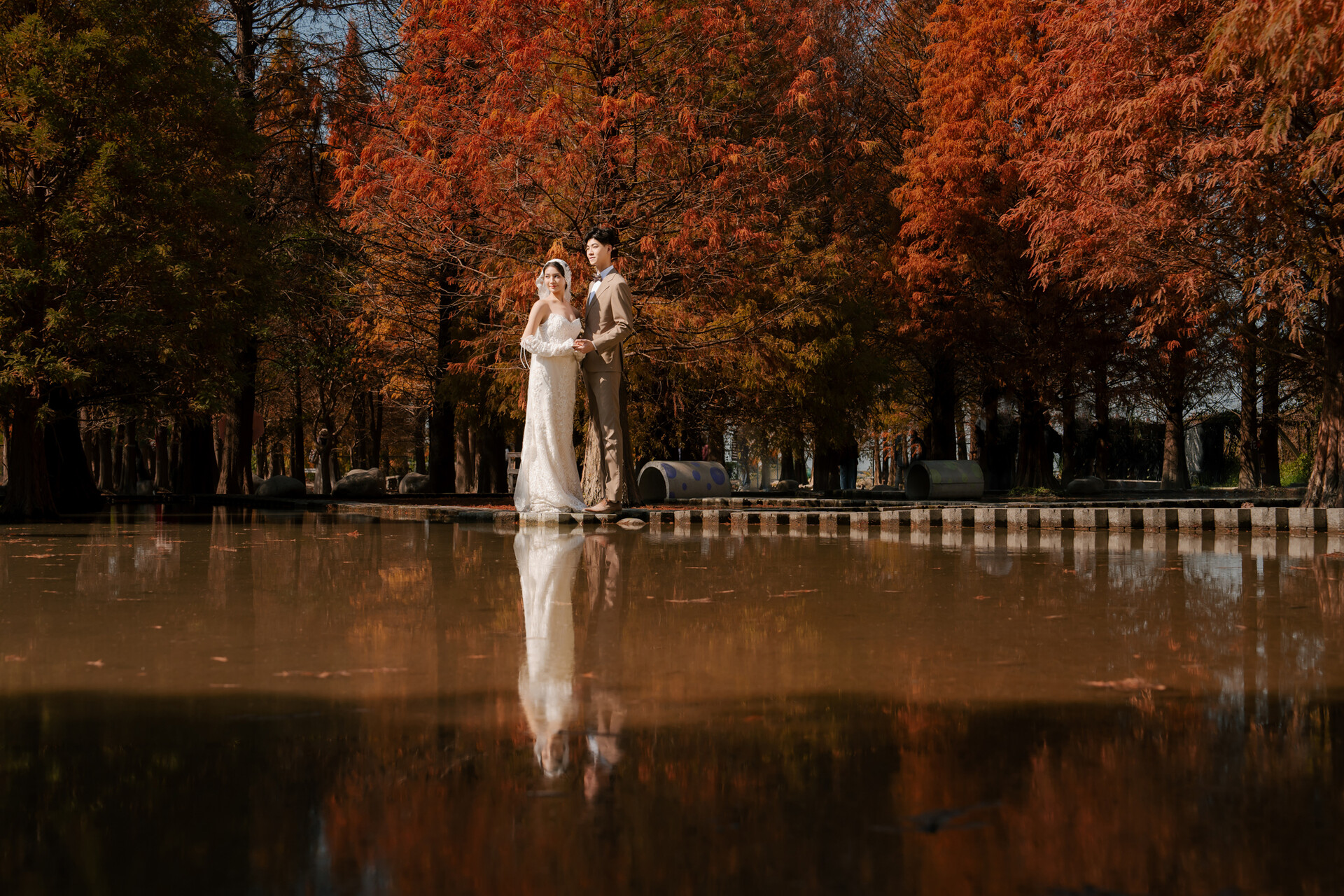 水面倒映著整排松林與身影,構成對稱而柔美的構圖;遠景開闊、近景溫柔,既能拍出大景氣勢,也能捕捉親密細節。無論是清晨薄霧,或午後暖光,都為婚紗注入不同層次的光感與溫度。